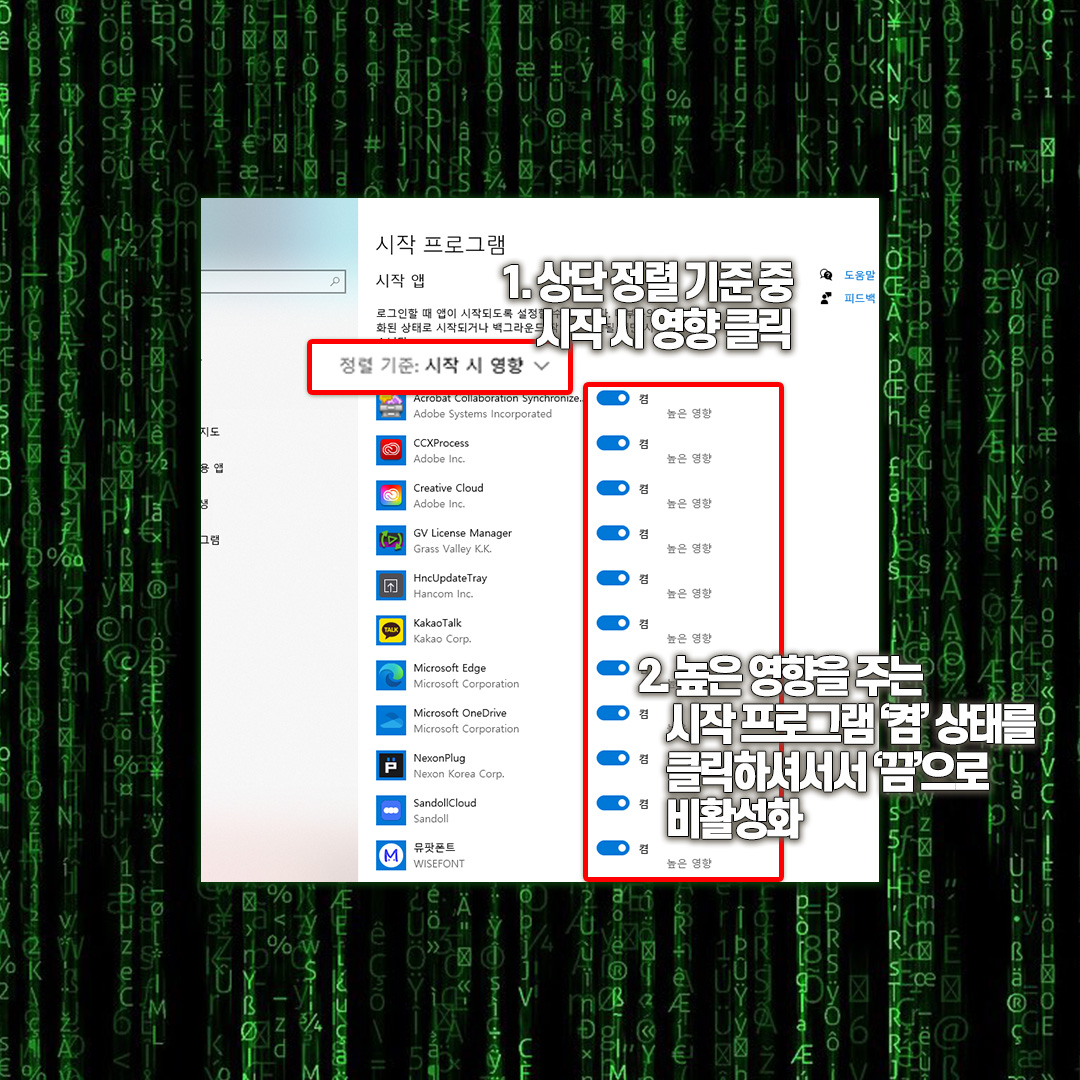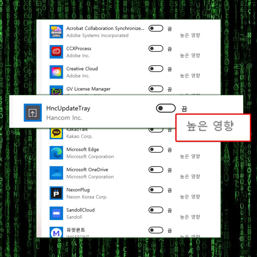 3번까지 보시고 이 글을 읽어주시는 분들은 다들 눈치 채셨을 겁니다. 저같 은 경우 이 높은 영향을 주는 시작 프로그램이 위 사진과 같이 엄청 많이 켜져 있었습니다. 이런 빌런 역할을 하는 시작 프로그램들을 모두 꺼줍니다. 아마 끔을 눌러도 되는지 고민되는 부분에 해당하는 프로그램이 있는 경우도 있을텐데 그 경우, 인터넷에 직접 그 프로그램을 쳐서 확인하시면 됩니다.