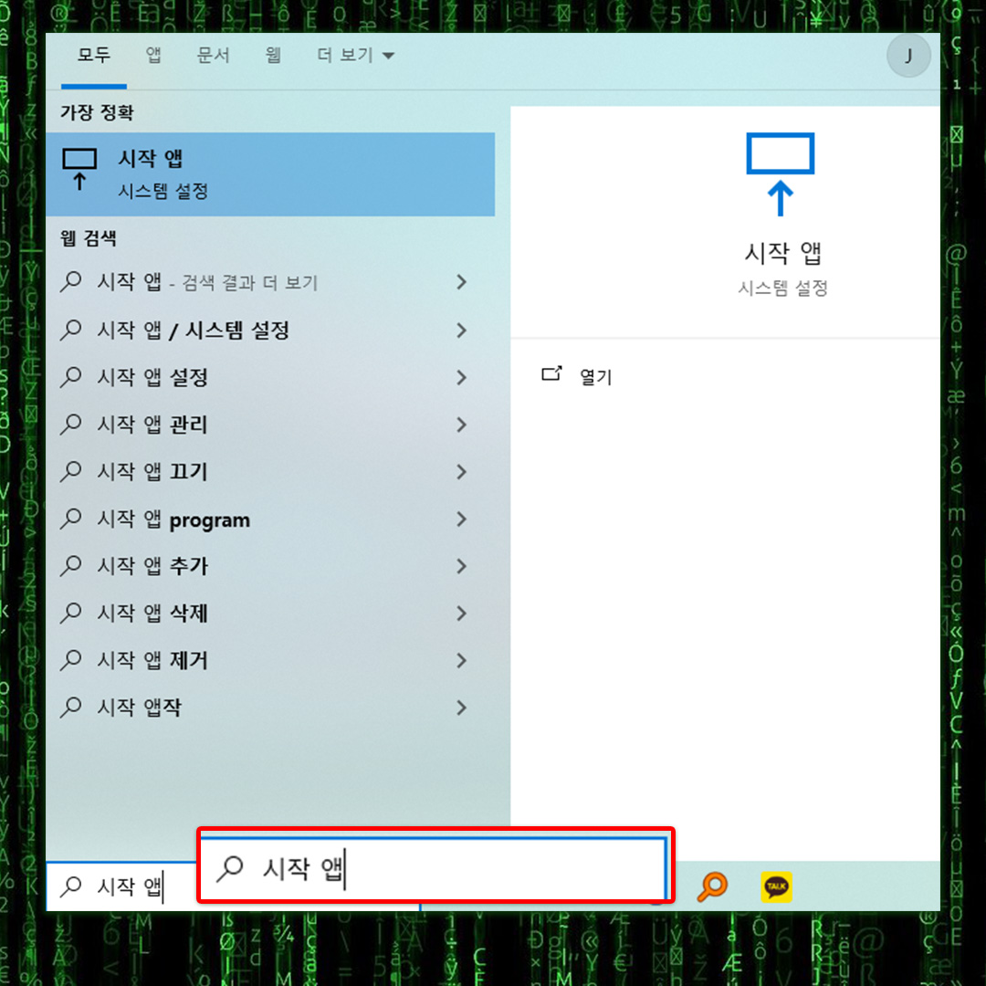 바탕화면 좌측 하단에서 윈도우키 누르면 나오는 목록 옆 혹은 윈도우 키를 눌러서 보이는 검색 창에 시작 앱을 입력해 준뒤 실행해 줍니다. '시작앱'이라고 치면 안 나오고 정확히 시작 띄고 앱이라고 입력해 주세요.