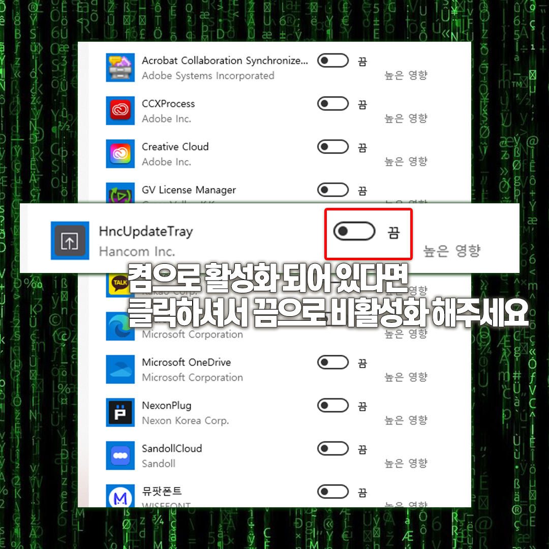 그러면 우리가 데스크톱 PC를 키는 경우 자동적으로 시작되는 프로그램들을 볼 수 있습니다. 여기에서 보면 HncUpdateTray라고 보입니다. 이 시작 앱 프로그램이 컴퓨터를 이용할 때 오른쪽 하단에 계속 광고를 띄우는 원인이라고 합니다. 아마 대부분 광고가 뜨시는 분들은 켬상태로 되어있을 겁니다. 이를 클릭하셔서 위와같이 끔으로 해주세요. 한컴오피스 체험판이나 한컴오피스 뷰어를 설치하는 경우에 자동적으로 설치되는 프로그램으로 악성코드처럼 인식되는 것이 아니라서 바이러스 검사만으로도 해결할 수 없다고 합니다.