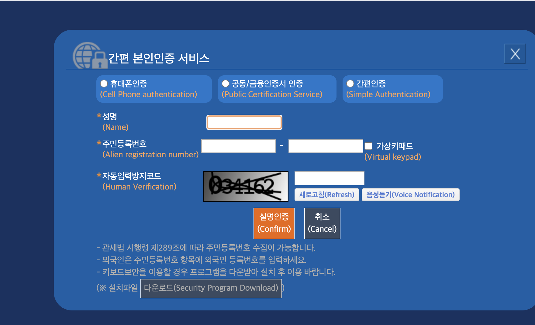 간편 본인 인증 서비스를 이용해 본인 확인을 완료합니다.