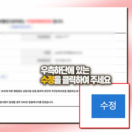 조회된 개인통관부호 화면에서 우측 하단의 ‘수정’ 버튼을 클릭합니다.