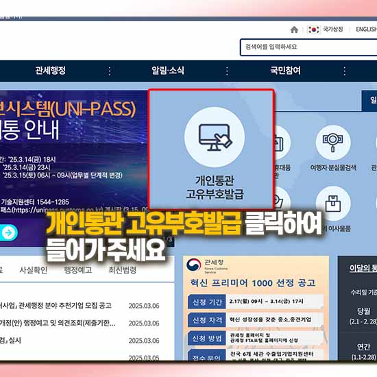 홈페이지 메인 화면에서 ‘개인통관고유부호 발급’ 메뉴를 클릭합니다.